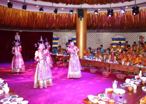 作为传统蒙古族宫廷大宴,诈玛宴对地点、装饰、赴宴者的身份和服饰均有严格的规定,赴宴者需提前更换代表尊贵的质孙服,依次落座,品尝草原上最高标准的特制餐食,就餐的过程中,更有全羊仪式、蒙古民俗歌舞和娱乐活动,尽显宫廷宴会的高贵和欢愉,完整再现了元朝宫廷宴会的盛况。